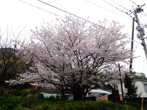 牛深も小雨です、サクラの花びらに影響あるかも山王神社のサクラです。岡東です満開になりました。花見で・・・・・・寒そうです。