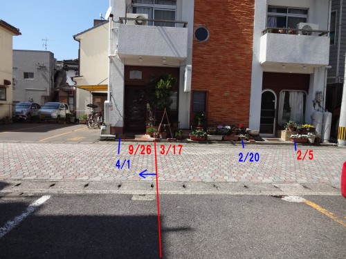 牛深も快晴、村長さんの日時計です。今日の影(赤線)です。9月26日と同じ太陽の高さです。(村の前のビルの陰を記録してます。4月1日になれば、青線まで来ます、遠見山の桜の花、間違って咲いてないかな?バイクで桜咲いてません。 牛深小学校で声がする。 昼休みの時間だろうか?せんだんの木の周りで遊んでました。今日気が付いた、3月9日で 8年目に突入してました。村娘2号が、『ブログ開設したから、書いてね』から始まりました。