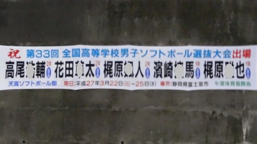 高校選抜と言えば、高校野球を思い出しますが?熊本県から24競技に出場しますバレーボール、サッカー、剣道、柔道、ハンド、空手、自転車弓道、陸上、ボート、新体操、体操、相撲、あといくつ? 11個え~と ? ボート ラクビー、テニス。ソフトテニス、卓球、ボクシングレスリング、ヨット、・・・・・・・ アーチェリー、エアライフル?重量上げ、これで24個かな ?あと何か、あったような? なぎなた(熊西?) 馬術(阿蘇中)? あ、ホッケー? 小国高が強豪ですね今から書くソフトボールが無い。 村長さんの情報、天草高校の男子ソフトボール競技に牛深出身の選手、4人が出場しますだるま舘の坂にあります。(少しピンボケです)静岡県にて開催されます。(22日~25日)