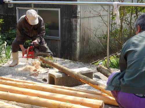 端午の節句用、鯉のぼりを上げる杉の木を立てます若衆が頑張ります。山から杉の木を伐りだし運搬、庭先の畑に設置開始、 穴は先に掘ってありました。まず、杭を打ちます、竿の補強用です。デカイ針金で結みます、杉の皮は山で剥してあります。(昔は竹を使ってたそうな!)若い力で立て始めましたまず、1本目、村長さんは現場監督でサインを送ります、矢旗用です2本目、3本目と手早い動きです、何か、本職みたいですね。Good!鯉のぼり用の一番上に飾ります。 クルクル回るやつ。 名前は、何に ?4本目も無事に立ちました、端午の節句。初めての経験です。名前の書いてあるのを上げてみた、あとは、ボチボチ上げるのかな。 村長さんはここまでで帰宅、疲れた、何も、肉体労働はしてないけど、疲れました、お手伝いの皆様、本当にありがとうございました。(感謝)