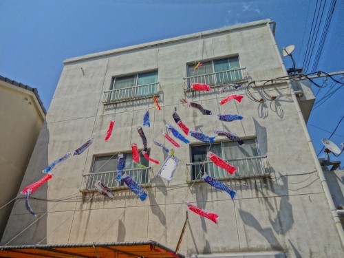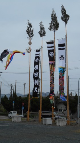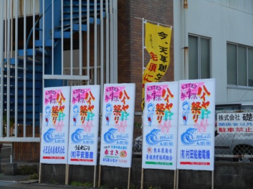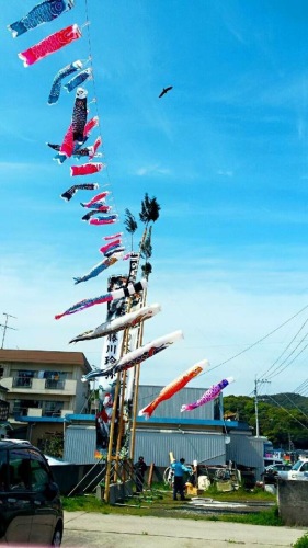 朝から・・・・晴れた牛深です街中には、ハイヤ祭りの立て看板がお目見えしました。これが立ったら、『さぁ、ハイヤ祭り』が近づいたと 今日の鯉のぼりですが 強風で泳いでます (青竹でしなってますね)大きな鯉のぼりから、小さな鯉のぼりも泳いでます。 天草、二江はイルカのぼりで、鹿児島の枕崎は鰹のぼりですね。牛深で作るなら、鰤のぼりかな?(鯛なら、膨らむので無理かな?)