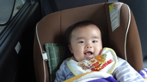 選挙投票を済ませ、村孫1号の鯉のぼりを視察へ さぁ、乗ったか? 『うん、乗ったよ。』 いつもの指定席へ。 さぁ、行くか!少し曇り空です。 鯉のぼりで遊んでますたくさんあるね。 村の鯉のぼりより、デカイね! 赤い鯉のぼりが5mあります。青空の時、元気に泳ぐでしょうね。