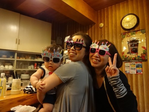 Happy Birthday to you 村娘1号達の声がした。あよ~。凄いサングラスです。 村孫1号も装着だ。 これも頂きました。名前入りのコークも! さて、明日から運転の時、どれにするかな?これのサングラスの運転手が村長さんです、ヨロシク! ケーキも頂きました。感謝!