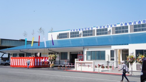 天草漁業協同組合 牛深総合支所水産物流通荷捌き所が落成しました取材に行ったら、時間が早かった、・・・・・ フライングでした・荷揚げ場では、漁師さんが網仕(あみし)を漁具の手入れをしてました。 2回目の取材で、 お祝いの獅子舞が披露されたました。見物人も多かった・牛深八幡宮、獅子舞保存会の皆さんです。 後の方では、牛深高校の郷土芸能部が待機してます さぁ、牛深ハイヤ踊りです 青色だけ?赤色だけ?ジャンプ!元気いっぱいに踊ってくれました。 感謝! 魚のセリ場を 祝いの餅投げに人が集まってきましたよ 荷揚げ場には、大漁旗を上げた漁船も 牛深町漁協も、舟津 岡東台場 後浜と移転しました。