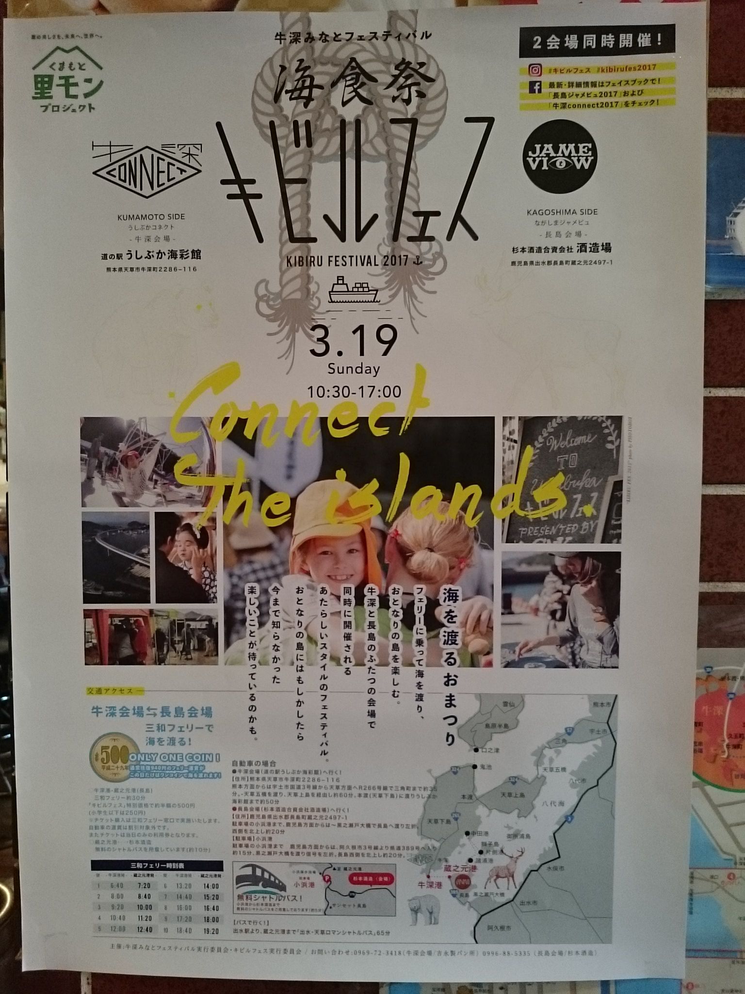 牛深の海彩館の広場にて 3月19日(日)10:30-17:00海食祭牛深港と蔵の元港の 2会場にて キビルフェス開催されます島んもんマルシェです牛深と長島を結ぶ(きびる)2会場に行くには、フェリーですが、往復ワンコインで乗れます