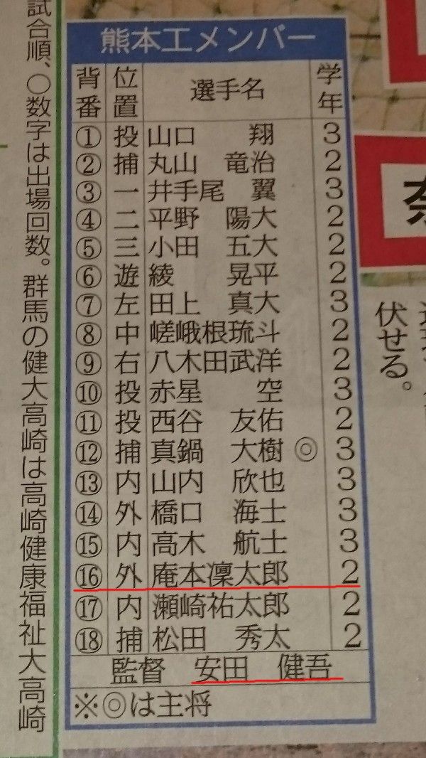 第89回 選抜高校野球大会19日、開幕です。熊本工業高校、秀岳館高校が出場しますが熊本工業高校のメンバー表です(西日本スポーツ新聞、参照)16番、庵本凛太郎君 2年 外野手 (学年は4月から)牛深中学校出身です 内外野、守れます また、安田健吾監督も 牛深中学校、熊工出身です