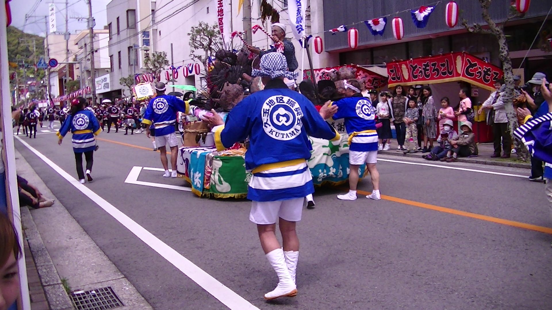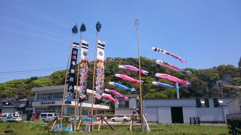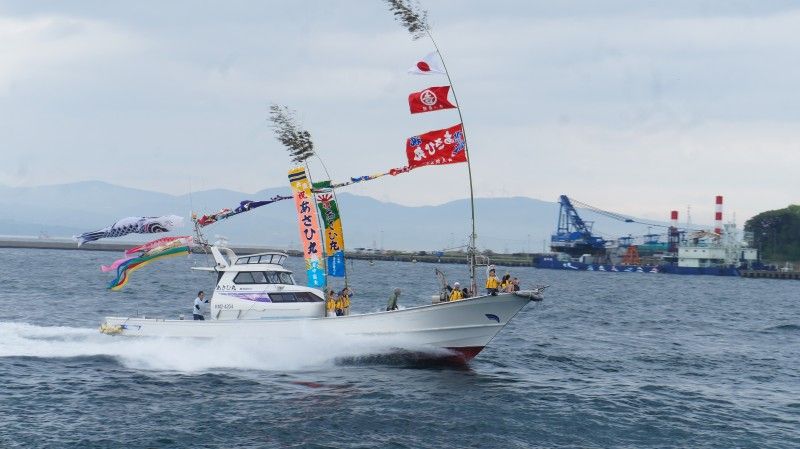 牛深、須口かし網組合による船団パレードです今年から、観光客も乗船出来ました(有料)港の中を高速で走ります鯉のぼりの船上を泳いでます!