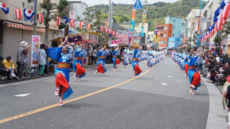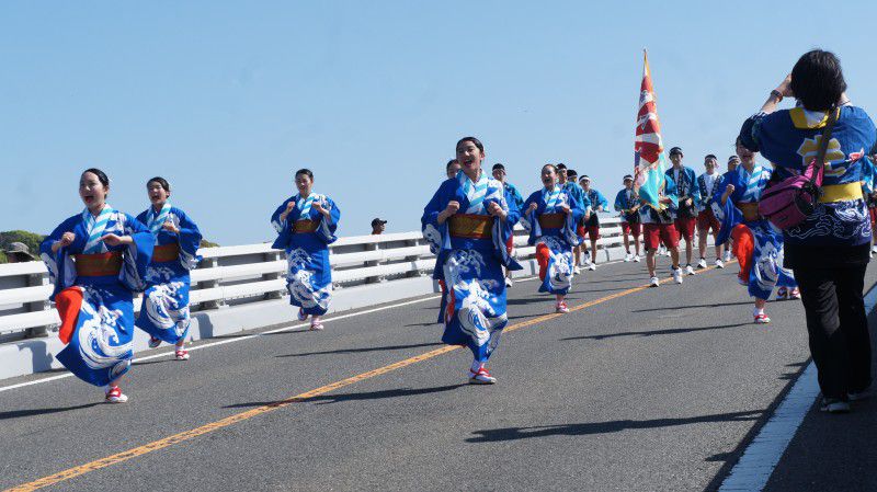 ハイヤ大橋を通行止めにして牛深高校の生徒、全員参加で、ハイヤ踊りを披露!郷土芸能部を先頭で ヨイサー、ヨイサー、サッサ、ヨイヨイ 気温も上がり、汗びっしょり 新入生 男子も踊ります牛深高校 郷土芸能部と新一年生女子は 16日(日)お昼からの総踊りに参加します