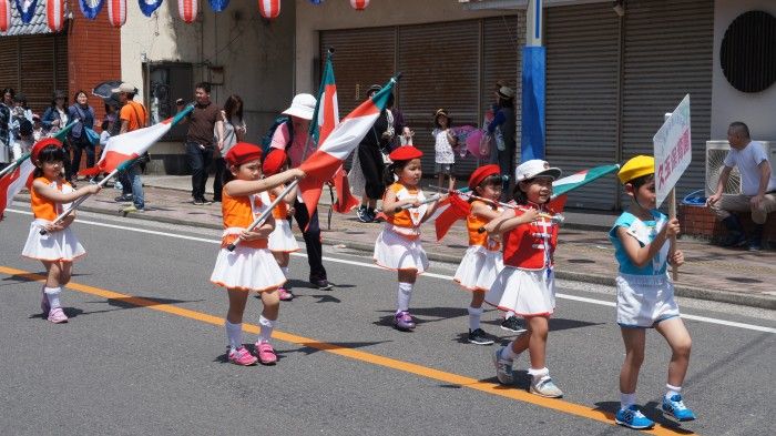 久玉保育園の園児たちです牛深高校吹奏楽と 牛深中と牛深東中の吹奏楽の合同パレードです