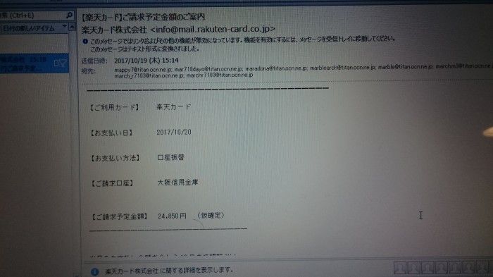 PCのメールに『楽天カード』から、引き落としの日の連絡が来た請求額 24.850円引き落とし金融機関 大阪の信用金庫などと!クリック詐欺かな?でも、カードは、銀行と郵便局とポイントカードだけ楽天カードなど持たないのだ。おかしくない、みなさんも、気を付けましょう!
