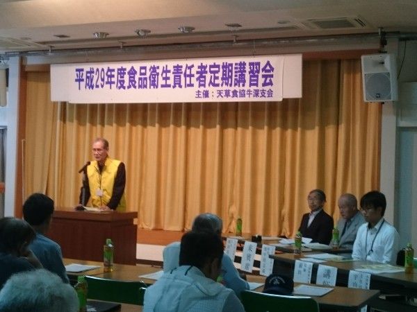 牛深総合センターにて 講習会各飲食店、お店、スーパー、水産業加工業まで食品衛生責任者、販売員から接客業まで、幅広く出席しました約200人以上は参加しました食中毒などの注意点など みっちり90分!数年後には、小規模な一般飲食店にHACCPが1、衛生管理計画2、計画に基づく実施3、確認、記録もう、この辺で、頭が混乱してきたまぁ、冷蔵、冷凍の温度確認 器具等の洗浄、消毒、殺菌 トイレの洗浄、消毒 従業員の健康管理 衛生的な手洗いの実施などまぁ、手洗いを確実にすることが一番大事かな!