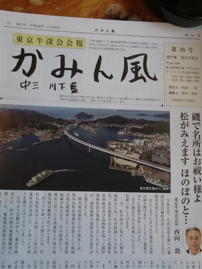 関東の東京牛深会様より 会報『かみん風』東京に在住の牛深人の会です東京での活動、牛深の年中行事や情報など掲載されてますホームページも開設されましたよ『東京牛深会』で検索して下さいhttp://www.tokyo-ushibuka.com/index.html平成29年度総会の日程 11月26日(日)詳しくは、HPで よろしく!
