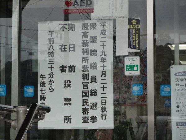 今度の選挙、雨に台風、久玉の祭り、全国朝市サミットもあり、街中でイベントあり投票に行けるか?不在者投票へ牛深支所へ 一度だけ経験してます投票権を持参 受付で 不在者投票の理由を 仕事にチェックを氏名、住所、生年月日で OKでした昔、一度した時、理由を聞かれ『野球の大会で熊本行くと!』係員、『あなたが、行かないと試合出来ないのですか?』と はぁ? ハイ、メンバーですから!係員、『ほかにメンバーが居るでしょ』 はぁ、なんば言うの? ほかの係員を呼んで !他の係員へ 『もう、よか、投票せんで 帰え~で』係員、『そがん、言わんちゃ、おねがいします』お願いされたので。カチンと来たが、大人と思い、投票したけど今なら、あおり運転では無いが おら。おらとあおるかも?皆様も、早めに投票しましう。投票所ですが 岡。岡東地区は、総合センター1Fでしたが、 当日は、支所1Fに変わりましたよ