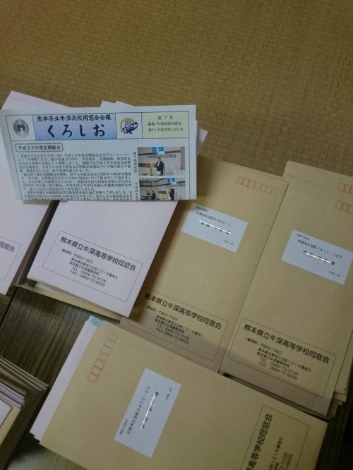 牛深高校の同窓会の会報を郵送作業を会報と2年分の会費のお願いを同封しました卒業生の皆様、宜しくお願い致します