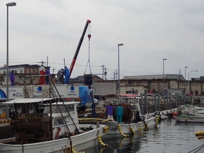 牛深港で水揚げ中でした?いや、水下し中でした。鮮魚車から、養殖船に乗せてました沖の生けすで大きく育てるのでしょうね15時現在、気温7度21時には、気温1度の予想、う~ん 寒くなりますよ