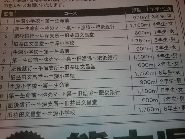 1月28日(日) 9時30分スタート第34回牛深地区子ども会駅伝大会 牛深小学校、スタート、ゴール牛深の街中を2周します地元の岡区舟津区の選手名簿が回覧板で紹介されてました 港のコースは 1年男女で どこどこの子どもと書いてあり 応援、頑張ります 2年前は、大雪で中止になりましたね。当日は晴天を願ってます
