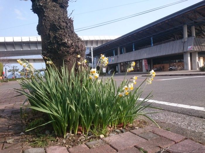 牛深支所の周りの街路樹の下に スイセンが咲いてます春になりました2月は逃げる、3月は去ると言いますが、 春よ早く来い植物は良く知ってますね!