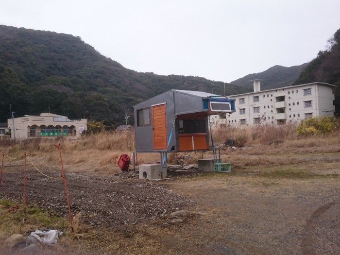 牛深の茂串にて 一戸建ての住宅かな?トラックの荷台に乗せて、キャンピングカー?いや、セメントの基礎に固定中ですが玄関あり、窓あり、 室内にテーブル、椅子もありでも、水道電気は ? トイレ無し! もちろん、風呂無し!ワンルームです。手作りの家ですね!