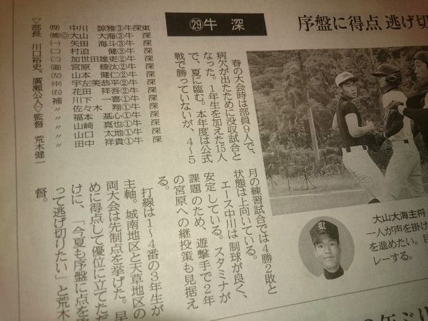 7月1日、夏の高校野球が開幕します学校紹介、メンバー紹介の記事が新聞に!(熊本日日新聞参照)牛深高校。野球部から投、中川 諒雅 3 牛深東捕◎大山 大海 3 牛深一、矢田 海斗 3 牛深二、村迫 健 3 牛深三、加世田雄市吏 2 牛深遊、宮原 稜汰 2 牛深左、山本 健仁 2 牛深中、花田 祥吾 2 牛深右、川下 一喜 1 牛深補、佐々木 翔 1 牛深補、福本 基心 1 牛深補、山崎 真也 1 牛深補、山口 太地 1 牛深補、田中 祥貴 1 牛深天草工業一、濱下 航成 3 牛深補、桂田 愛斗 3 牛深補、加世田浩希 3 牛深補、田尻 大基 3 牛深東天草拓心高(旧苓明、天草農業)捕、池田 玲雄 2 牛深二、佐々木勇輝 2 牛深遊、佐々木春輝 3 牛深(兄弟)ルーテル高 (旧九州女学院、男女共学)中、山下 行則 2 牛深学園大付属(熊本商大付属)補、近藤 真悟 2、牛深東開新高 (旧第一工業)左、黒沢 亜輝 2、牛深東熊本工業補、庵本 凛太郎 3、牛深(監督、安田健吾、牛深中卒)東海大星翔(旧東海大第二)補、西岡 太陽 3 牛深専大玉名補、磯口 湊 2、牛深天草補、西指 香亮 2、牛深がんばれ 高校球児!
