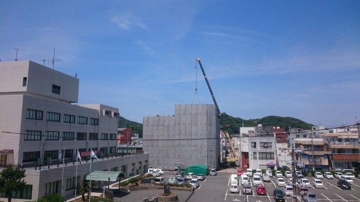 旧寿屋の解体工事シンボルマークの看板を撤去!牛深のハイヤ通りにありますがクレーン車で釣り上げ?(防音シートに覆われてます)でも、工事の音は凄いですね看板は青く塗りつぶされてますこのまま下すのかな?何と、青色の部分を外しして 軽くして下しました街中では、新築するのか? 更地にして、分譲で販売とか? 観光ビジネスホテルが出来るとも?うわさです!