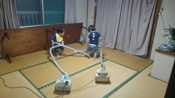 2日は、宴会がありましたお客様がお帰りなる時、 手を振り 笑顔で見送った 村孫2号 1歳11か月で、お片付け、タイム!お皿を1枚づつ、コップも1個づつ、『じぃじ、あらってくらはい!』みんなでお片付け 早いですで、『さぁ、掃除機をかけて!』1号、2号で取り合いが始まる3歳半が勝利!(村孫1号)で、3階から持って来たら。掃除合戦です、やっぱり2台、必要ですねもう、ここは済んだよ あっちして !母親は ここにゴミあるよ、 ここも!声を出すだけ 本当は、を撮影をしてますお手伝いもしました。明日、カルピスとアイスクリームをあげます!