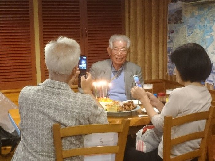 村長さんの叔父さん、卒寿です誕生日おめでとう長男さん達がお祝いを 毎日、自転車で魚釣りに行くのが日課です自宅、カラオケも OKです