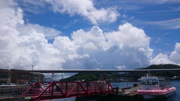 牛深、 夜中に、 朝から、晴れてたが、雷が鳴る 土砂降り 11時には、良か天気になり、蒸し暑く、13時の港、 積乱雲 モコモコ、わくわく こんな感じです長島の方角は、黒い積乱雲があります また、夕立かな?