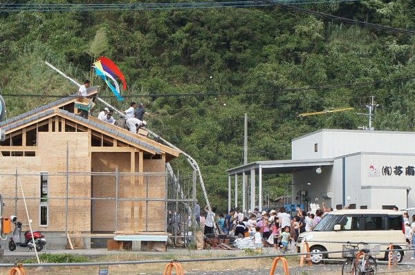 牛深の後浜にて、木造の平屋造りの新築です19時から、持ち投げとの情報で10分前に!もう、始まってました子供たち、エプロン姿の大人まで、拾ってました餅が空中を舞う、飛ぶ、 歓声があがり、素手でキャッチ、ソフトのグローブでキャッチ!今、流行のプラモデルハウスではありません!