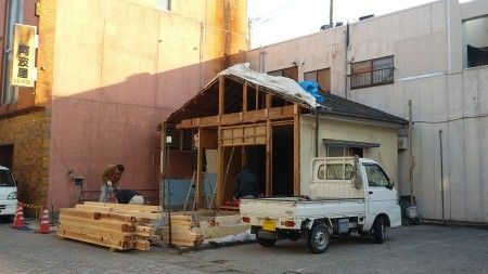 牛深街中、改築中の続報です1月月9日のつづきデス基礎が出来き、材料が到着しました 8時45分半分は残してあります、シロアリの被害もありましたあれよ、あれよと 組み立てますさすが、プロですね 14時45分明日、棟上げかな? お祝いの餅投げあるのかな?