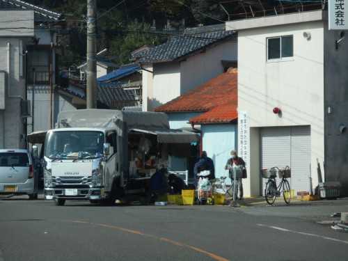 牛深町真浦の広場にて、 トラックが店を出し、野菜を販売してた高齢者が自転車、台車を押して買い物に来てた近くのスーパーマーケットに行くのに、 遠くは無いが近くも無い!近くの広場まで来てくれるから、便利!野菜に果物まで車社会で、郊外店(街の外)までは行けないのだPS 牛深も少子高齢化と言われてるが、新築の家が増えてますコンパクトな家が多くなりました、関係者の情報で14時半から餅投げと聞いたが?奥様の情報では、満ち潮の時だと今日の干潮が 16時24分ですから、17時から投げるのかな?