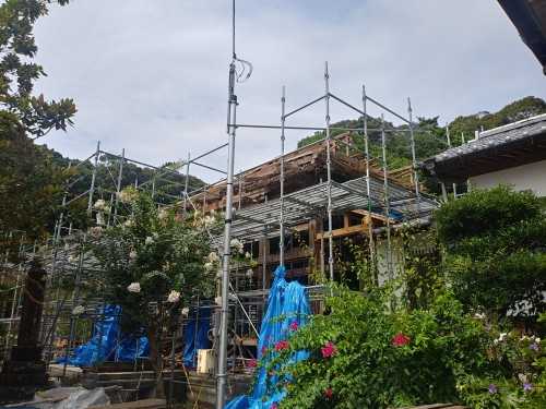 久玉のお寺、無量寺さん梅雨時期が終わり、ブルーシートが取れてます。こんな感じです足場を屋根の骨組みがあらわに!木材の痛みもあります宮大工さんは。久留米から来てます吉田地区に宿舎を借りて 工事してます完成は、年明けの予定ですが遅れてるみたいです完成の餅投げは?(お祝い事ですから)