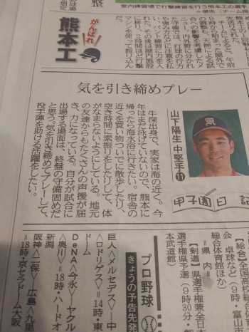 高校野球、雨天で順延ですが明日晴れたら、第一試合で長崎商業 対 熊本工業牛深中学校出身の球児ローカル紙のスポーツコーナーに掲載された記事です(熊本日日新聞、参照)2年生、背番号11外野手ですが ????記事を読んで!暇があれば、散歩せず、素振り、素振り、素振り、100回30mのライナーのキャッチボールをしろ、ダッシュ、30本!みなさん、11番を見つけたら、応援よろしくデス!