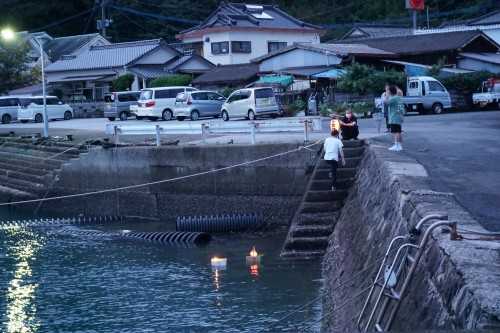 お盆の墓参りへあ、同級生のお墓へ、吉田の高校裏へだれ~も居らん、探したら、すぐにあった(牛深に一軒だけ)兄姉さん達、関西で新型で移動自粛で来てないみたい。お参りをすませ、あっちこっちへ19時過ぎ魚貫まで走る 20時からの流す予定だと!その前に 家族が見送りしてたデカいのが来た。一家の家紋の入った黄色い提灯が先導です一度、降ろして、準備の確認船に乗せるのかな?待ってると? 岸壁の階段を降ろした若衆が海の中まで入り、 泳いで安定させた船からロープが来て、えい航準備OKですまだ、泳いでる、岸に上がって、OKのサイン!家族の船で沖まで運び、流して、回収ですね別の精霊船が来た。いきなり階段を下り、海面に浮かべた見送りの鐘がなる、カンカンカンカンカン!若衆、二人がザブーンと海中へ入った、押しながら泳いだ、押して平泳ぎ。先のえい航する船まで泳いだ沖に停泊の船まで泳いだのち。ロープでえい航して、港から沖へ出て行った。各地区で見送り方が違いますね