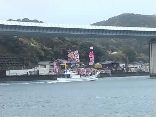 お昼から、養殖船を待つ、フェリー乗り場にて (午前中、強風で欠航中、沖では白波がたってた)牛深岡東、台場へ入港船の衝撃防止の、黄色いクッションが船の機械店の海岸で、餅投げフェリー乗り場へ来た皆さん、ライフジャケット着てます赤いライフジャケットの人、後輩で村長さんを見つけて、餅を投げてくれた、ここから、実況中継ピュー、と 1個届いたけど、届かず、海中へドボン船から、岸壁、投げる、投げる、海へも落ちる村長さん10個ほどゲット拾えない、小さい子どもへ。おすそわけした餅が海に落ちる 勿体ない、お祝いの餅だおっと、近くで先輩が魚釣り中、『先輩、たも(網)を貸して下さい』 OK撮影を忘れて、たもを持って走る(あとは想像してください)あっちこっち、すくう、網に入れる こっちも浮いてる(餅は水に浮くうの?ナイロンに袋入り)で、後ろを見ると、網を持ってる、村長さんを カシャ カシャ取材しに来て、取材されてる~ !で、餅を投げる人、拾う人の写真無し!残念