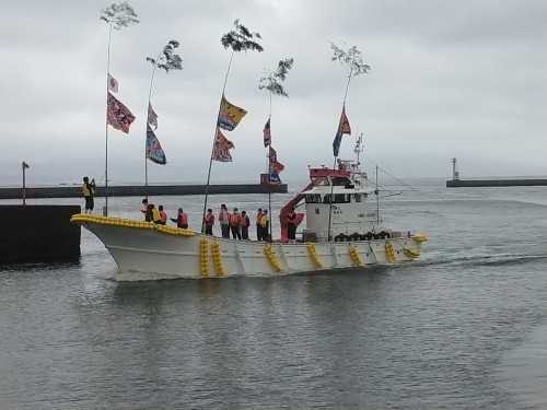今日は、1年で一番良い日だと!牛深の港では、新造船の餅投げがありました2艘で1艘は 漁船もう一艘は、養殖場の船ですまず、牛深港を走る新船後浜漁港へ行く 車で追う おいおい、どこへ行くの後浜漁協の荷上場だ 移動した、入港してきた岸壁にはたくさんの出迎えだ(餅投げを拾う人)天附の『明勇丸』、棒受け網など接岸して、始まりました雨上がりでも、屋根付きの荷上場だから OK新造船で、おいくらかな?