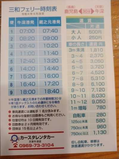牛深のフェリー、4月1日から、1便減ります10便 9便へ牛深の始発が 6:40 7:00牛深から最終便が 18:40 18:00蔵之元からの最終便が 19:20 18:40九州新幹線のダイヤ改正に合わせたのかな?問題は、出水駅へのシャトルバスも、減便?やっぱり、5便に バスの時間を確認しましょう出水駅の乗り換え時間に余裕があります変更で朝一番のフェリー、バス、新幹線で大阪へ時刻変更で、1時間遅く到着することに!