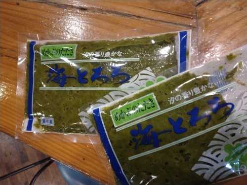 牛深のお茶さんから、初物を頂きました汐の香り豊かな 『海とろろ』ですめかぶのたたきですえ、お茶さんで海産物を製造販売 わかめ、からすみなどこのお店は、お茶屋さん、海藻屋さんは仮の姿で、インスタで有名な、抹茶アイスクリーム屋さんですでも、初物のめかぶを美味しく頂きました ポン酢で