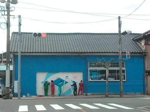 牛深の銭湯(みつ湯)跡、花屋跡を改装してます町おこし隊ですどう起すのか。街の人達と話し合うと?まだ、見えないが起点を整備して、外装を塗り直し中海のイメージでイルカのしっぽが見えてる作業中の若者たち、都会から来てます牛深以外は、都会かな?昔は、人口3万人以上居たよね4万4千人時、牛深市になったよどんな町おこしになるのかな?楽しみデス
