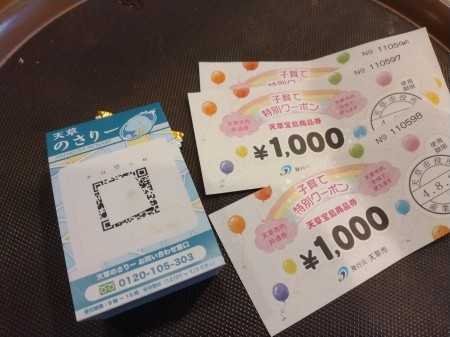 子育て特別クーポン券&電子クーポン使えますお食事、お弁当、オードブルなどにQRコードを読み取り、金額を入力、ポイと押す OKです 紙クーポンでは、1000円単位で支払い出来ます (天草宝島商品券)例えば、チョコレートパフェ700円×3個=2100円紙クーポン2枚+現金100円でOKまたは、現金でも OKです使用期限が 8月31日まで!