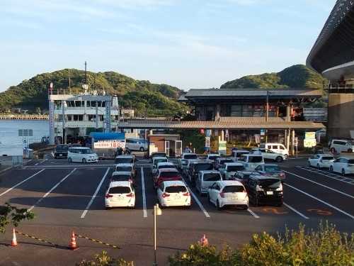 大型連休も半ば、県外ナンバーも多い。フェリー乗り場にも、バイク乗りも多い牛深への帰省客も多いのか、街中を走るが、わき見運転、スマホも多い。フェリーには、バイク、乗用車、1BOXばかりトラック、貸し切りバスは、お休みだな牛深発、最終便です下船する車、満車で来た。長島蔵之元港、乗れず、1便待ちと(90分)蔵之元港の最終便は 18時40分、早めに行動しましょう。昨夜の海彩館の軽自動車、1BOX、高価なキャンピングカーなど四国、近畿、北陸とか!東京都、江東ナンバーなど