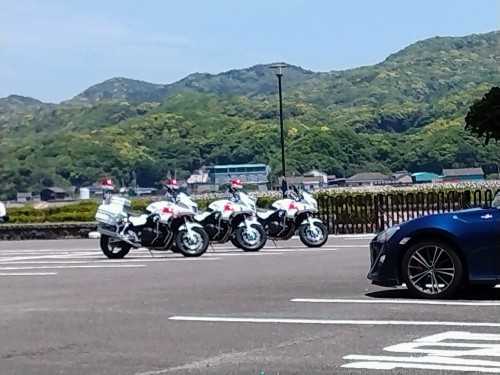 牛深の街中をパトロールしてたが、ランチタイムかな?駐車場に並んでた。3台、ワンチームですね駐車場も各1台分、上天草警察署に所属と聞く!昔のお話、白バイは、500㏄と聞いた、 400ccだと、パワーが無い、 500ccだと、小回りパワーもあり 取り回しが楽と!急なUターン、せどわへ入れる (白バイは、牛深のせどわ知らんだろう!)デカい1200ccなどは。交通安全のパレードとか、護衛の時、走りますでも、牛深街中で交通事故、 午前1件、午後1件と聞いた、 (右折、左折の事故)救急車も出動してた。消防署は、連休無いね、感謝!