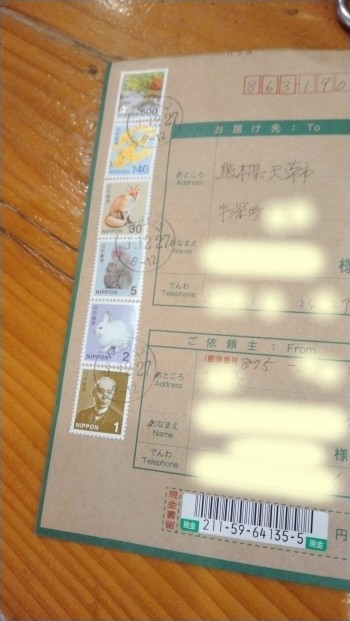 親戚から。魚を送って、代金送るからで、現金書留が来たら、切手の数にびっくり!500.140.30.5.2.1円6枚貼ってあり、678円ですが口座振り込みが安いかな?昭和の人ですから、 お金送るなら現金封筒ですね!
