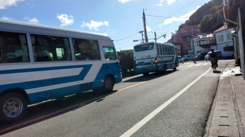 今日、明日、牛深ハイヤ大橋、9時から、16時まで工事のため、通行止め後浜工業団地、天附方面へは岡東から、船津加世浦方面へ通行します 加世浦の交差点にて前のバスは、通常の路線バス、後ろのバスは、始発の牛深市民病院へ向かう、回送バスですその他、大型中型トラックも走る個人の車も走る、自転車、歩行者もいます特に、通学の時間帯ではゆっくり安全運転でお願いします通行止めは、天草市のHPで確認下さい