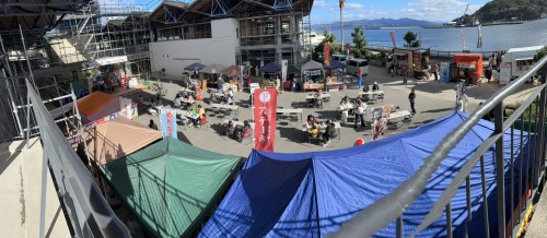 牛深海彩館の広場にて14時頃ですが、気温8.9度、風が冷たい!ステージでは、サンタさんが夕方、19時まで