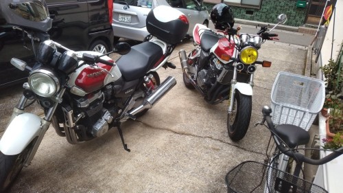ホンダCBのバイクですホンダカラーの赤、白です何㏄かな? 排気量です900ccかな?左のバイク、1300cc、右側が 900cc村長さんの時代で、大きいので、ナナハン(750cc)でした軽自動車で 660cc2台の違い、マフラーが 1300が2本に分かれ 900は、1本の集合マフラーですお値段は、軽自動車より、安いかも?でも、気温低い、風冷たい!ブル!