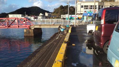 牛深の気温 10度、風が冷たい海岸へ行くと、お仕事かな?素潜り漁を海水温は、何度だろう?ウェットスーツを着てますたらいを海面に浮かべ手鉤(てかぎ、海底の獲物を引っかけて取ります)腰に重りをつけて潜ります何を捕るの、うに、あわび、サザエさん?(漁には、漁協組合の組合員で許可が必要です)