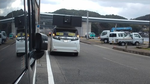 また、カメラを乗せた車?グーグルマップ撮影用かな?後方の窓ガラスには作業中。接近注意と張り紙車の上に、デカいスピーカーと回り込むと、カメラがあったけど?中国地方の県ナンバーでした。後方カメラが怖くて、車の陰から撮影したよ