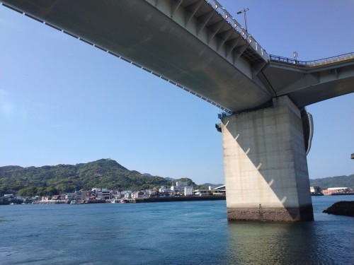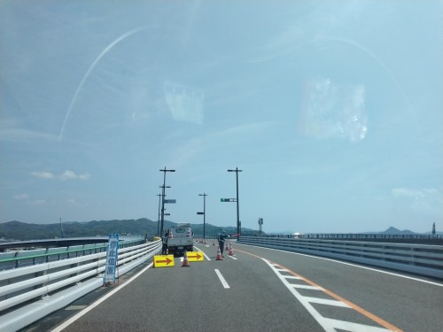 牛深ハイヤ大橋、来年3月まで工事が片側通行でした旗振りで、停止二か所目の停止です無いと困る、ハイヤ大橋です旗振りの仕事、 冬は風が冷たく、寒い 夏は暑くて熱くて、大変だ
