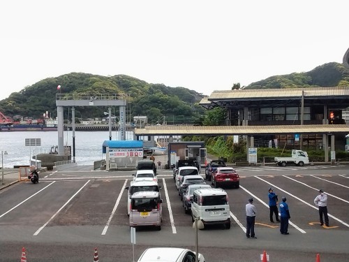 連休中のフェリー乗り場乗船待ちの車列です前日の夕方の18時の最終の状況まだ乗れるが、積み残しの時は臨時便あり朝から、8時20分発の乗船待ち下船の車、満船状態長島蔵之元港からが、多いかも?