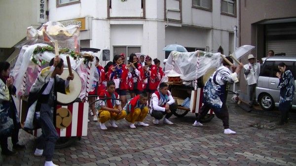 笛、太鼓はびっしょり濡れてますが、力強く叩いてますが?